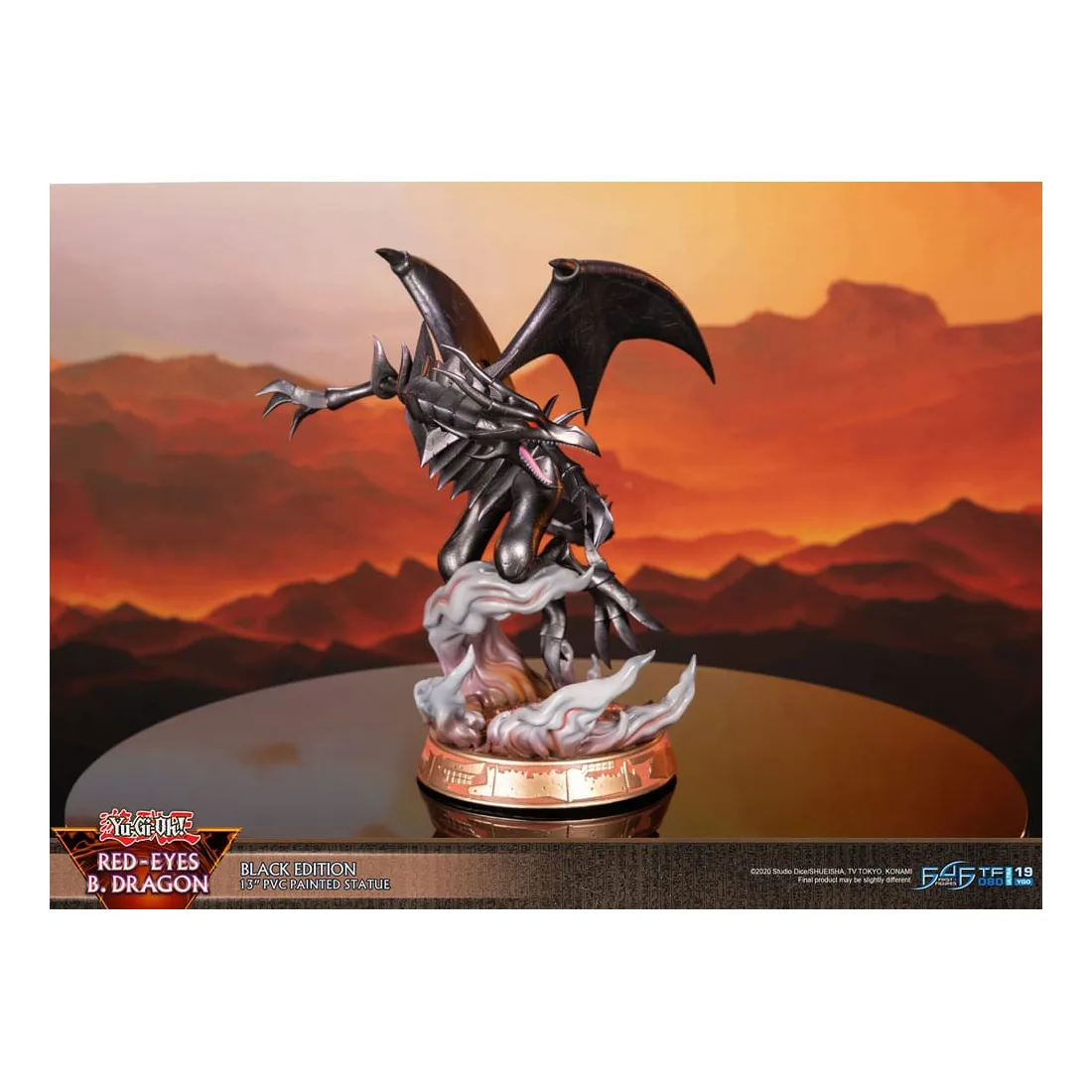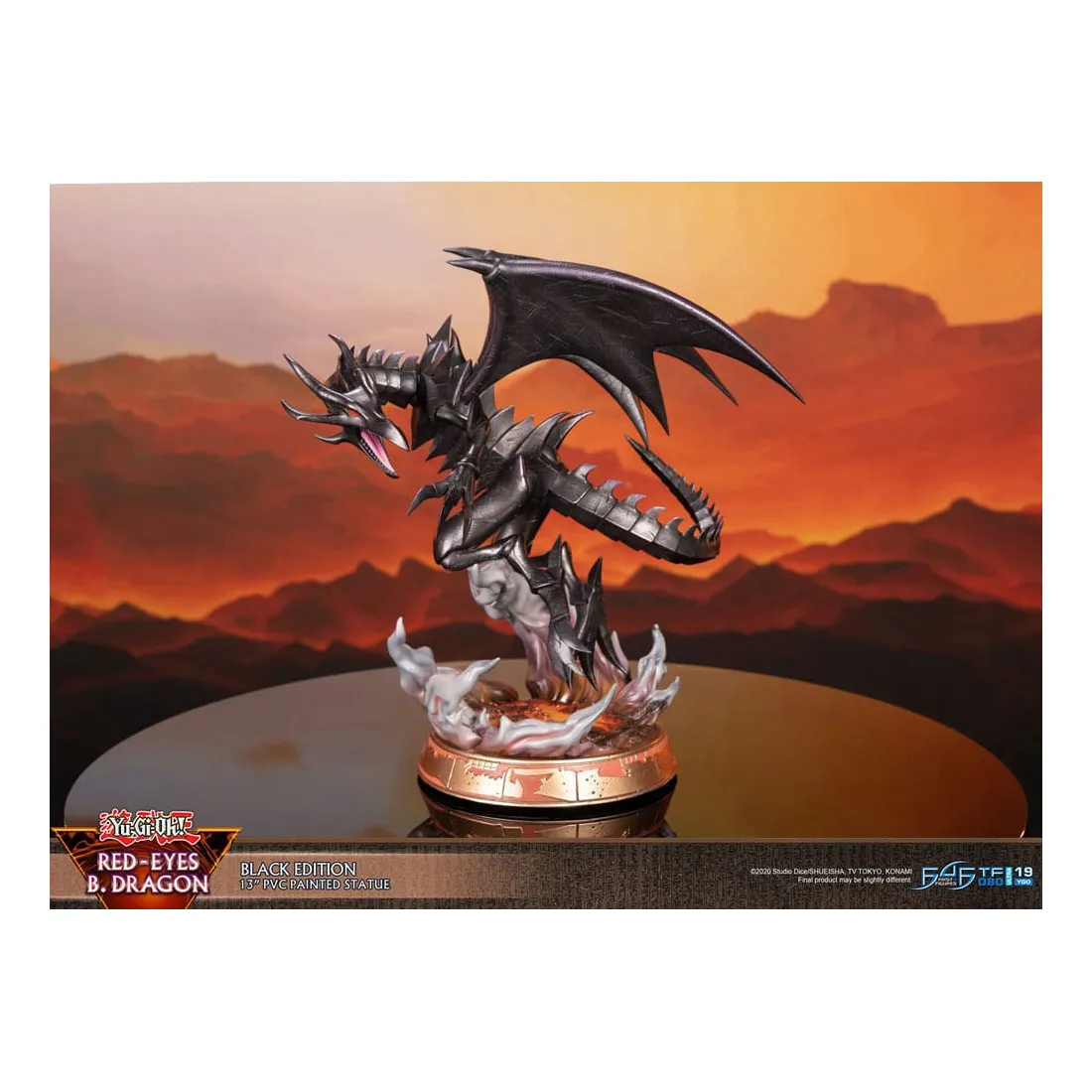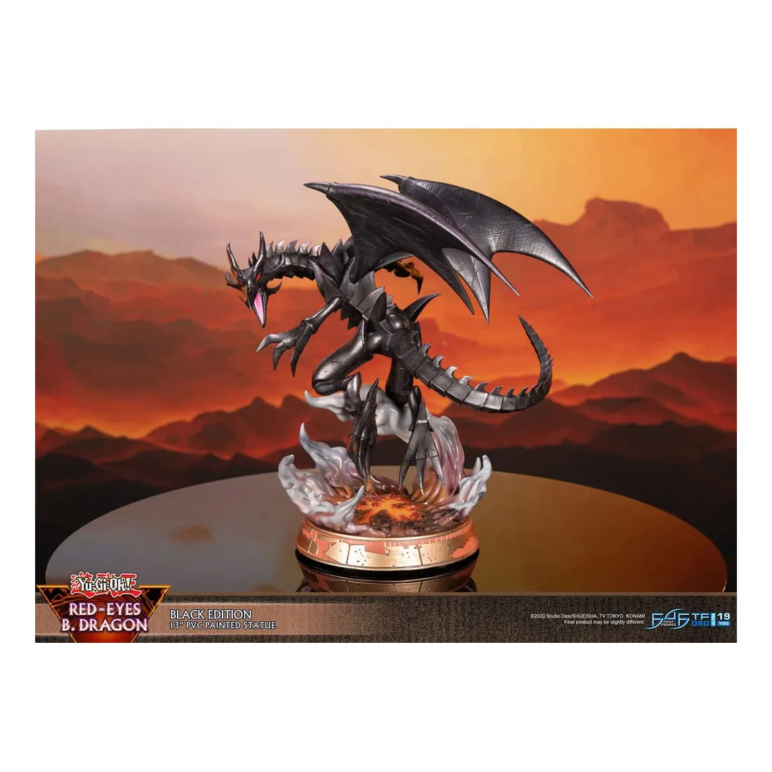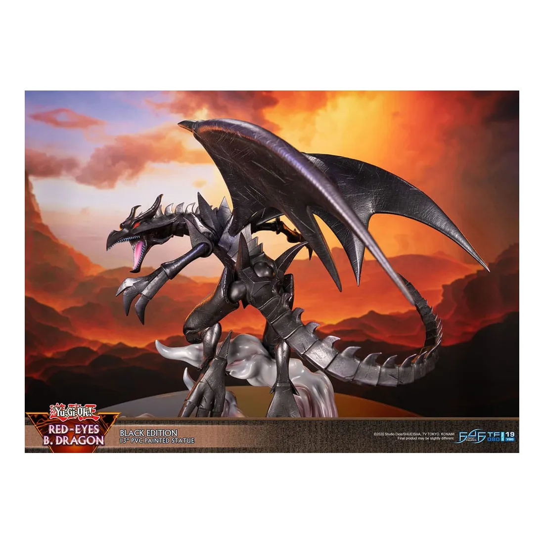 Le concept de la statue s’inspire de la force inégalée et de la férocité inflexible du Dragon noir aux yeux rouges (Red-Eyes Black Dragon), brillamment représenté dans une pose dynamique. La base très détaillée, avec un environnement captivant de lave, de fumée et de flammes, complète la nature féroce du monstre. Les motifs sur les côtés de la base rappellent l’époque de l’Égypte ancienne.