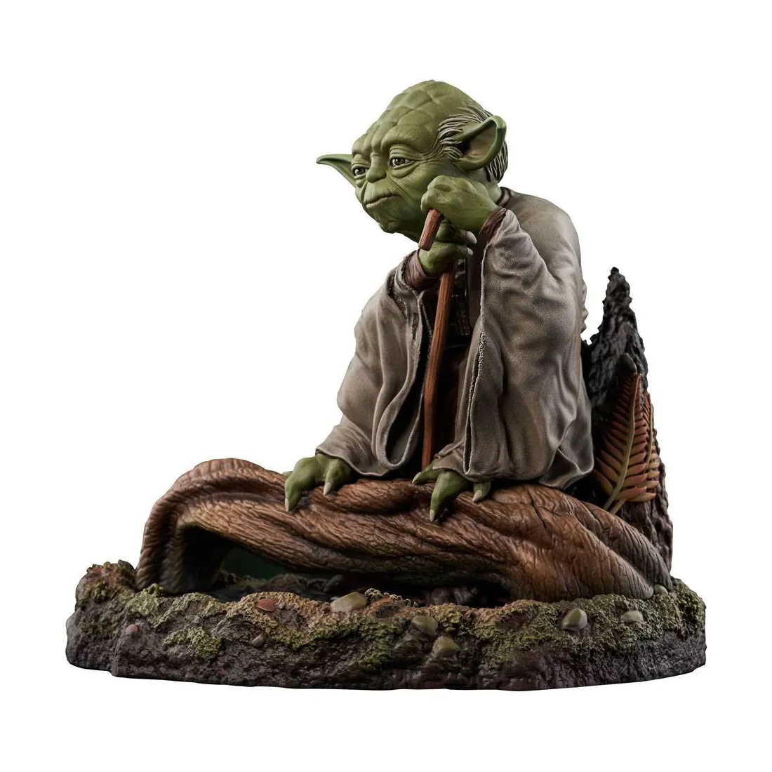 Yoda est un des personnages iconiques de l’univers de Star Wars. Maître Jedi très puissant enseignant à Luke Skywalker, on le découvre pour la première fois dans les marais de la planète Dagoba. Cette figurine en résine de Yoda représente le personnage tel qu’il est dans le film, posé sur une branche avec sa canne en main.